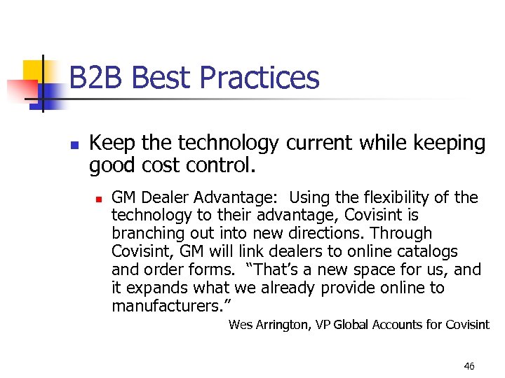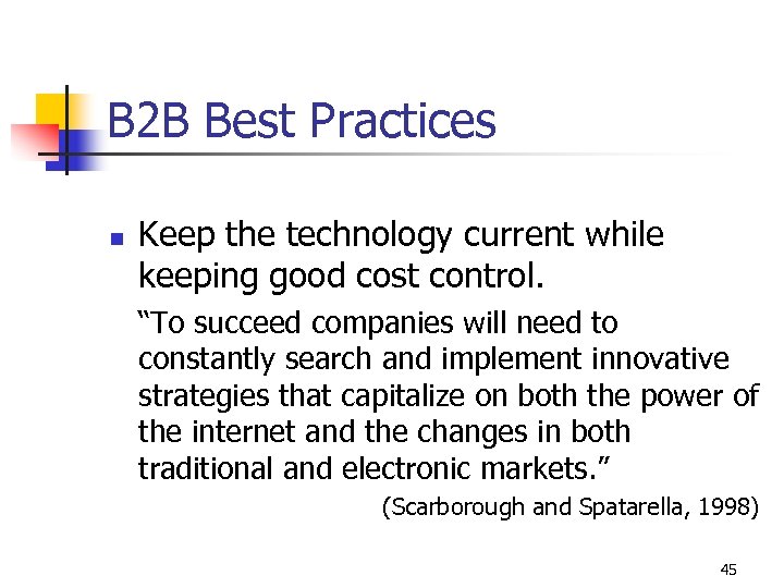 B 2 B Best Practices n Keep the technology current while keeping good cost control. “To succeed companies will need to constantly search and implement innovative strategies that capitalize on both the power of the internet and the changes in both traditional and electronic markets. ” (Scarborough and Spatarella, 1998) 45