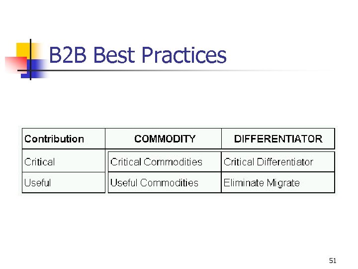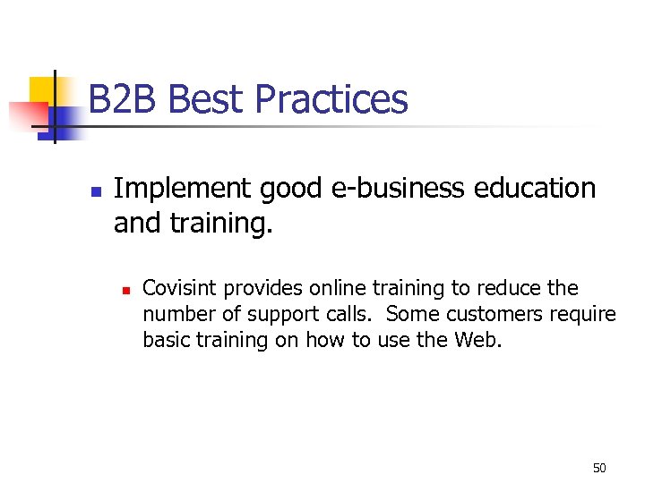 B 2 B Best Practices n Implement good e-business education and training. n Covisint provides online training to reduce the number of support calls. Some customers require basic training on how to use the Web. 50