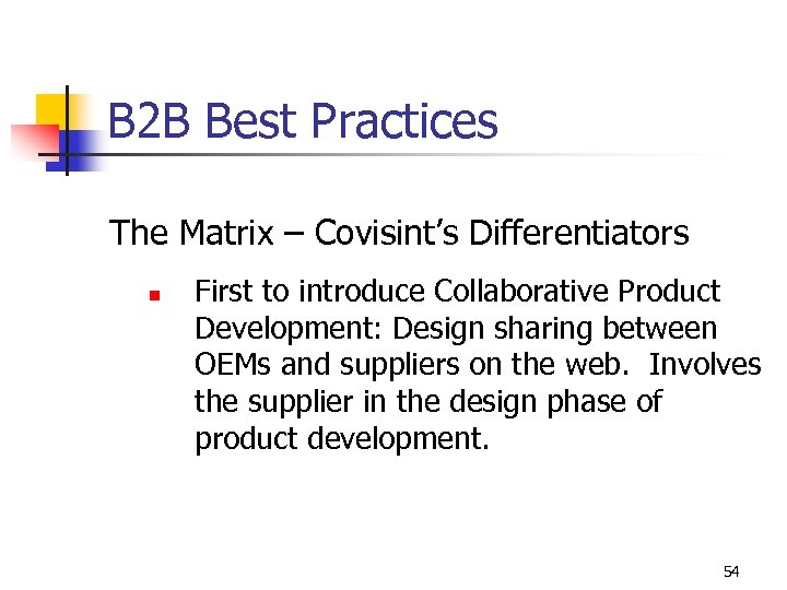 B 2 B Best Practices The Matrix – Covisint’s Differentiators n Created a single technical platform (standardized) so suppliers could easily and cost effectively join the exchange. Keep in mind some of these suppliers are resourceconstrained as the profit margins are continually squeezed by the Buyers. 53