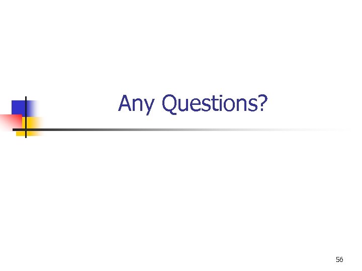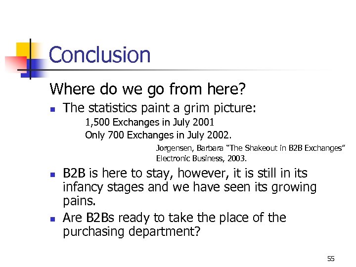Conclusion Where do we go from here? n The statistics paint a grim picture: 1, 500 Exchanges in July 2001 Only 700 Exchanges in July 2002. Jorgensen, Barbara “The Shakeout in B 2 B Exchanges” Electronic Business, 2003. n n B 2 B is here to stay, however, it is still in its infancy stages and we have seen its growing pains. Are B 2 Bs ready to take the place of the purchasing department? 55