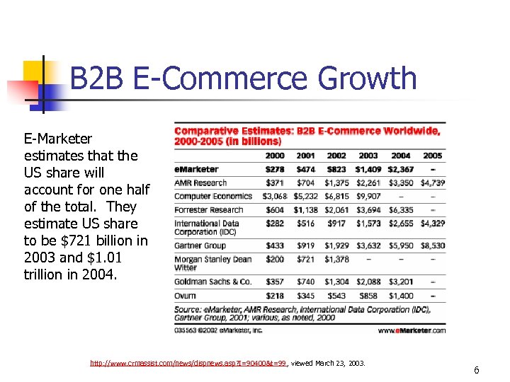 B 2 B E-Commerce Growth E-Marketer estimates that the US share will account for one half of the total. They estimate US share to be $721 billion in 2003 and $1. 01 trillion in 2004. http: //www. crmassist. com/news/dispnews. asp? I=90400&t=99, viewed March 23, 2003. 6