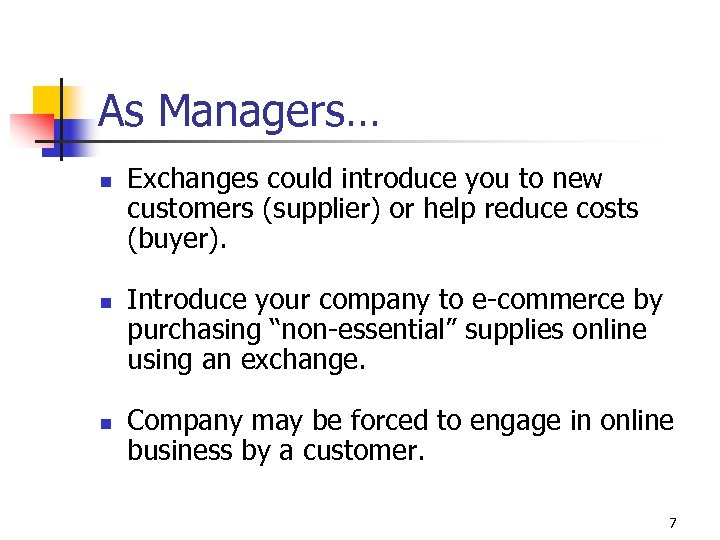 As Managers… n n n Exchanges could introduce you to new customers (supplier) or help reduce costs (buyer). Introduce your company to e-commerce by purchasing “non-essential” supplies online using an exchange. Company may be forced to engage in online business by a customer. 7