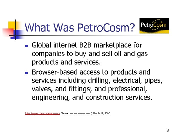 What Was Petro. Cosm? n n Global internet B 2 B marketplace for companies to buy and sell oil and gas products and services. Browser-based access to products and services including drilling, electrical, pipes, valves, and fittings; and professional, engineering, and construction services. http: //www. chevrontexaco. com “Petrocosm announcement”, March 23, 2000. 8