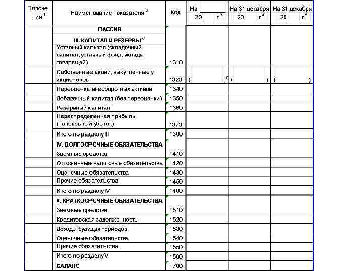 Пояснения 1 Наименование показателя 2 Н а Код 20 На 31 декабря 3 г. 20 г. 4 20 г. 5 АКТИВ I. ВНЕОБОРОТНЫЕ АКТИВЫ Нематериальные активы Результаты исследований и разработок Нематериальные поисковые активы Материальные поисковые активы Основные средства Доходные вложения в материальные ценности Финансовые вложения Отложенные налоговые активы Прочие внеоборотные активы Итого по разделу I II. ОБОРОТНЫЕ АКТИВЫ Запасы Налог на добавленную стоимость по приобретенным ценностям Дебиторская задолженность Финансовые вложения (за исключением денежных эквивалентов) Денежные средства и денежные эквиваленты Прочие оборотные активы Итого по разделу II БАЛАНС 1110 1120 1130 1140 1150 1160 1170 1180 1190 1100 1210 1220 1230 1240 1250 1260 1200 1600
