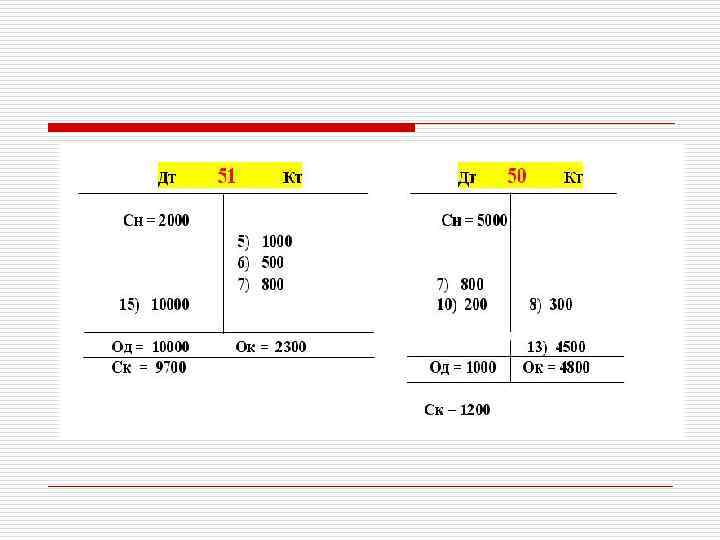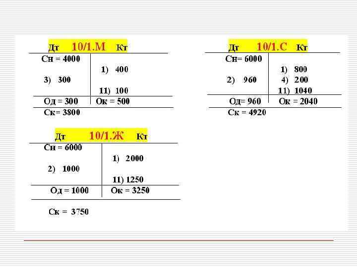 СТРУКТУРА ПАССИВНОГО СЧЕТА Название Д (дебет) 3. Операции по уменьшению источников (-) 5. 1. К (кредит) Сн - остаток на начало периода 2. Операции по увеличению источников (+) Од - дебетовый оборот (сумма всех хозяйственных операций за период по дебету) 4. Ок - кредитовый оборот (сумма всех хозяйственных операций за период по кредиту) 6. Ск - Остаток на конец периода (1 + 4 - 5) Ск Д (пассивного счета) = Сн + Ок - Од «Название счета» Сн Од Ок Ск К