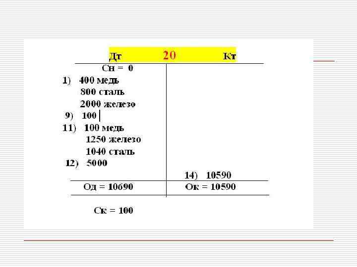 11. Отпущено в производство o меди 1 т Дт 20 – Кт 10/1. М 100 o железа 25 т Дт 20 – Кт 10/1. Ж 1250 o стали 13 т Дт 20 – Кт 10/1. С 1040