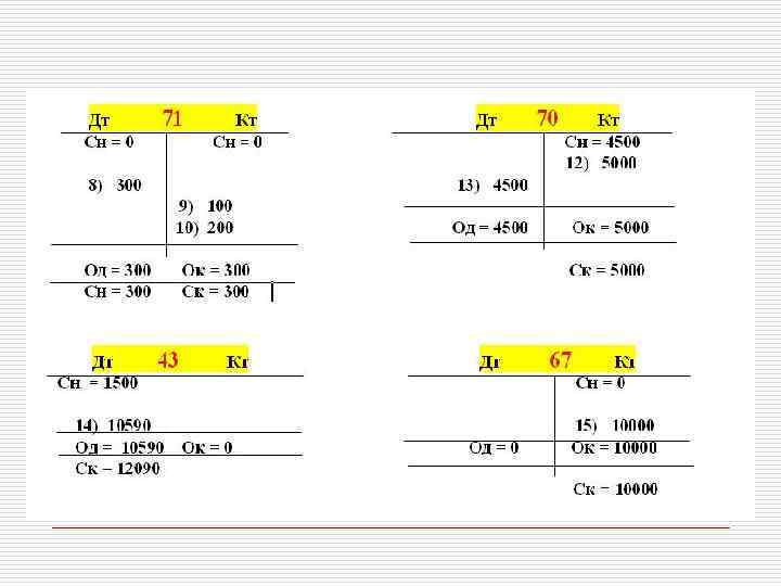 12. Начислена заработная плата рабочим основного цеха 5000 рублей Дт 20 – Кт 70 5000 13. Выплачена заработная плата из кассы 4500 рублей Дт 70 – Кт 50 4500 14. Поступила на склад готовая продукция на 10590 рублей Дт 43 – Кт 20 10590 15. Зачислен на расчетный счет долгосрочный кредит банка в сумме 10000 рублей Дт 51 – Кт 67 10000