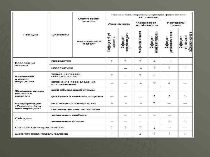 Основания для оценки Статическая концепция Динамическая концепция Цели баланса Защита интересов кредиторов Защита интересов собственников и администрации Принцип денежного измерения Интерпретация не различается Принцип имущественной обо собленности При покрытии кредиторской задолженности допускается включение в актив средств, принадлежащих владельцам Личное имущество собственников исключается из активов, если оно не вложено в организацию Принцип учета по себестоимости Ориентируется на цены возможной продажи ( «фиктивной ликвидации» ) Сохраняется и ориентируется на выявление размера признанного расхода Принцип непрерывности деятельности Предполагает оценку активов в условиях фиктивной ликвида ции, принцип не используется Сохраняется Принцип осмотрительности Ориентируется на оценку активов по наименьшей стоимости из себестоимости и продажной цены Направлен на определение момента признания дохода при исчислении результата Принцип реализации Не уделяется внимание Направлен на выявление суммы признанного дохода