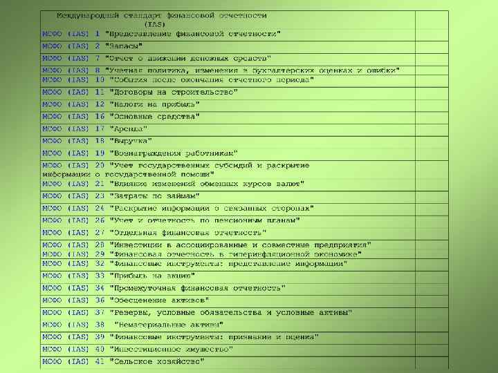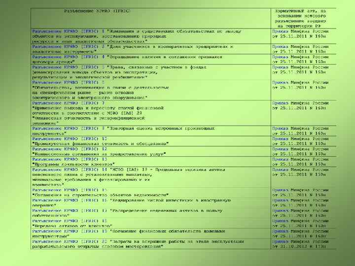 Нормативные акты, регулирующие порядок применения МСФО в РФ • • • Федеральный закон от 27. 07. 2010 N 208 -ФЗ "О консолидированной финансовой отчетности « Постановление Правительства РФ от 06. 03. 1998 N 283 "Об утверждении Программы реформирования бухгалтерского учета в соответствии с международными стандартами финансовой отчетности « Постановление Правительства РФ от 25. 02. 2011 N 107 "Об утверждении Положения о признании Международных стандартов финансовой отчетности и Разъяснений Международных стандартов финансовой отчетности для применения на территории Российской Федерации « «План Министерства финансов Российской Федерации на 2012 - 2015 годы по развитию бухгалтерского учета и отчетности в Российской Федерации на основе Международных стандартов финансовой отчетности» (утв. Приказом Минфина России от 30. 11. 2011 N 440) Приказ Минфина России от 31. 10. 2012 N 143 н "О введении в действие документов Международных стандартов финансовой отчетности на территории Российской Федерации « Приказ Минфина России от 25. 11. 2011 N 160 н "О введении в действие Международных стандартов финансовой отчетности и Разъяснений Международных стандартов финансовой отчетности на территории Российской Федерации « Приказ Минфина России от 18. 07. 2012 N 106 н "О введении в действие и прекращении действия документов Международных стандартов финансовой отчетности на территории Российской Федерации « <Информация> Минфина России N ОП 1 -2012 "О применении Международных стандартов финансовой отчетности « <Информация> Минфина России N ОП 2 -2012 "О применении Международных стандартов финансовой отчетности"