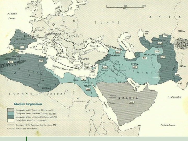 Spread of Islam to Three Continents Under the leadership of various leaders the Muslims spread as far north as France and south into southern Africa. l A large Muslim settlement was established by the Berbers in Spain. l –Lead by Jabal Tariq –He was so revered they Gibraltar after him. named the Rock of Corodoba, in Spain became a center for the spread of Islam in Europe l – 70 libraries, 700 mosques, 27 free schools –Population of 500, 000 –All religions were welcome in Corodoba