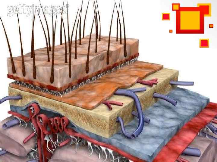 Дерма – второй слой кожи • Представляет из себя полисахаридный гель, в который погружены клеточные структуры и белки – коллагеновые и эластиновые волокна. • Основная клеточная структура – фибробласты - субстанции, которые вырабатывают белки: коллаген и эластин. Коллаген – заполняющий белок Эластин обеспечивает напряжение и эластичность кожи