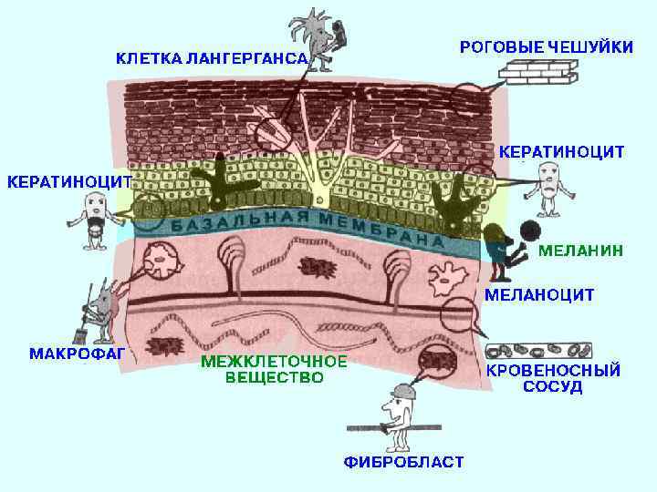 Эпидермис Клетки : 3 типа клеток Кератиноциты: Обеспечивают сплоченность эпидермиса Образуют барьер между внешней и внутренней средами Защищают организм от солнечного излучения Клетки Лангергарса: Отвечают за местный иммунитет, обеспечивают иммунную защиту кожи Меланоциты: Синтез меланина