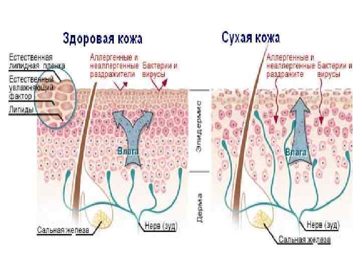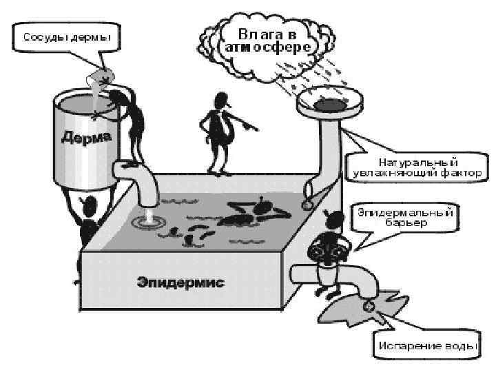 Основные признаки обезвоженной кожи: • Истонченная, «пергаментная» кожа со сниженным тургором, плохо расправляются складки • Сеть мелких морщинок в необычных местах (вне мимических морщин) • Шелушение и участки покраснения кожи • Ощущение стягивания после умывания Контроль за увлажненностью кожи • уменьшение испарения воды из кожи за счет создания воздухопроницаемой пленки на поверхности кожи, которая сохраняет и удерживает влагу в эпидермисе и препятствуют ее испарению из глубоких слоев.