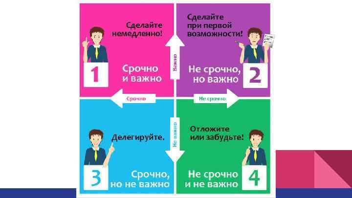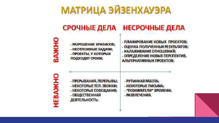 Матрица Эйзенхауера на практике НВ: ключевые, стратегически-важные задачи, саморазвитие СВ: проблемы с планированием, форс-мажор СН: Ненужные переключения, потеря времени НН: Бессмысленная трата времени