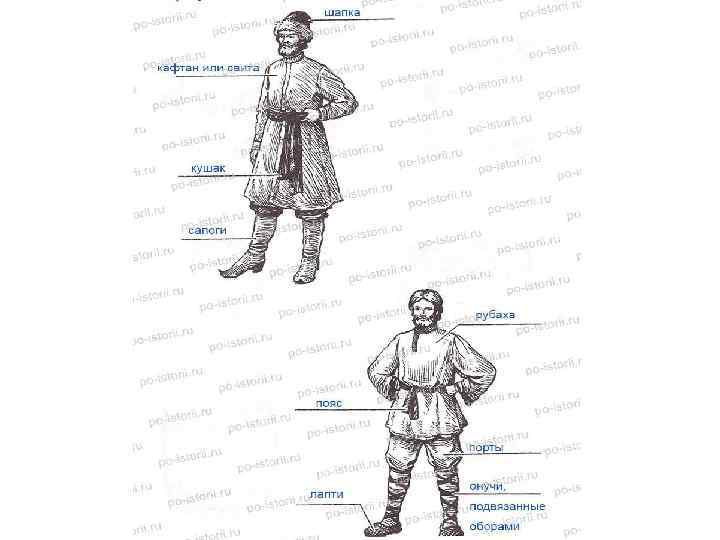 Мужской костюм простолюдина состоял из холщовой рубахи с разрезанным воротом и шерстяных домотканых портов. Украшением был узкий пояс, украшенный металлическими бляшками. Верхней одеждой были зипуны — застёгивающиеся кафтаны без воротника, с длинными узкими рукавами. Ноги оборачивали узкими и длинными кусками ткани — онучами, на которые надевали лапти из коры липы.