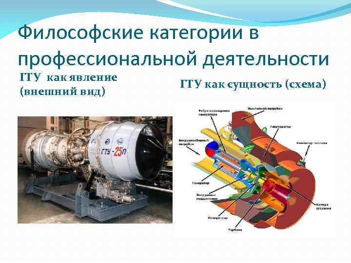 Философские категории в профессиональной деятельности ГТУ как явление (внешний вид) ГТУ как сущность (схема)