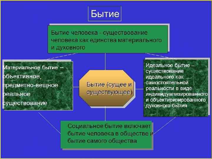 Понятие о существовании, о сущем вообще, это материальные вещи, все процессы (химические, физические, геологические, биологические, социальные, психические, духовные), их свойства, связи и отношения. 1 БЫТ ИЕ Ответ