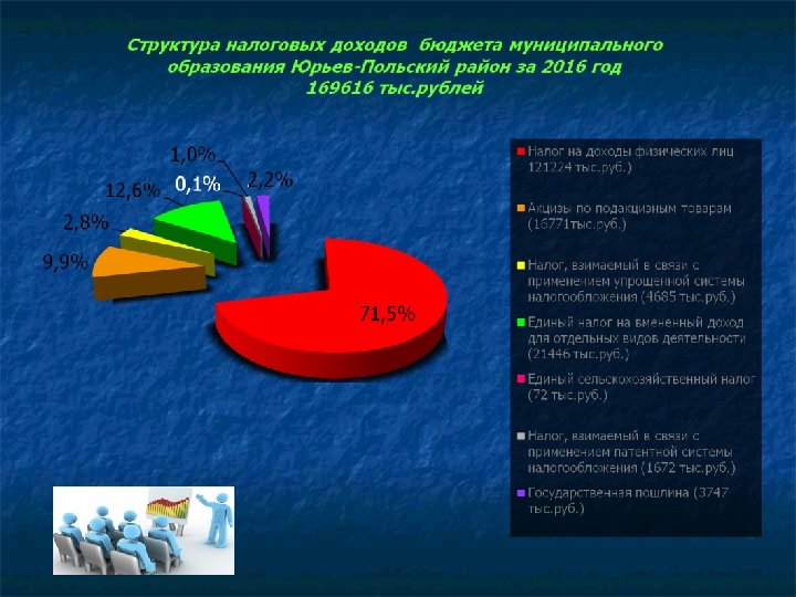 Главным источником налоговых доходов являются платежи, администрируемые межрайонной ИФНС России № 3 по Владимирской области. Удельный вес налоговых доходов в собственных доходах составил 82, 2%. Поступило в бюджет налоговых доходов в сумме 169616 тыс. руб. , или 103, 1% к годовому плану. В структуре налоговых доходов бюджета поступление федеральных налогов составляет 83, 6%, специальных налоговых режимов 16, 4%. Наибольший удельный вес составляют: налог на доходы физических лиц- 71, 5%, налоги на совокупный доход- 16, 4%, акцизы-9, 9% Поступление налога на доходы физических лиц составило 121224 тыс. руб. при плане 120447 тыс. руб. Акцизов поступило 16771 тыс. руб. при плане 13000 тыс. руб. В 2016 году поступления налогов на совокупный доход составили 27875 тыс. руб. или 101, 5% к плану (налог, взимаемый в связи с применением упрощенной системы налогообложения 4 685 тыс. рублей, единый налог на вмененный доход 21 446 тыс. рублей, единый сельскохозяйственный налог 72 тыс. рублей и налог, взимаемый в связи с применением патентной системы налогообложения 1 671 тыс. рублей). Госпошлины поступило в бюджет муниципального образования в сумме 3747 тыс. руб. (103, 2% к плану).