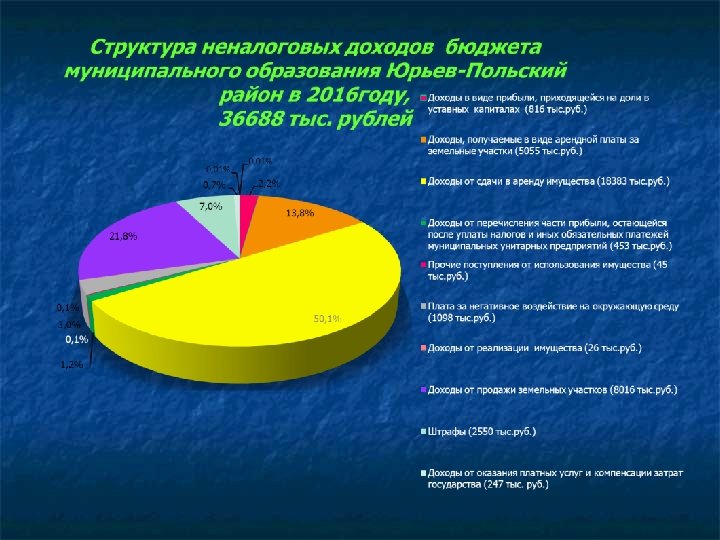Неналоговых доходов за 2016 год мобилизовано в бюджет в сумме 36 709 тыс. руб. или 111, 3% от годовых бюджетных назначений. Одним из основных источников неналоговых доходов являются доходы от использования муниципального имущества. В общей сумме неналоговых доходов доходы от использования имущества, находящегося в муниципальной собственности составляют 67, 4%, их поступило в отчетном периоде 24752 тыс. руб. Менее значимым источником неналоговых доходов 2016 года являются доходы от продажи материальных и нематериальных активов (имущество и земельные участки) – 8042 тыс. руб. , выполнение 158%. Поступления различного вида штрафов за 2016 год составили 2550 тыс. руб. или 102, 0% к годовым назначениям Кроме этого, в неналоговых доходах учтены поступления платы за негативное воздействие на окружающую среду в сумме 1098 тыс. руб. , прочих неналоговых доходов 20 тыс. руб. , прочих доходов от оказания платных услуг и компенсации затрат государства 247 тыс. руб. Недоимка по налогам и сборам в бюджет муниципального образования Юрьев. Польский район по состоянию на 1 января 2017 года по сравнению с началом года уменьшилась на 1427, 4 тыс. рублей и составила 2718, 3 тыс. руб. , в том числе по: федеральным налогам 1023 тыс. руб. , специальным налоговым режимам- 1695 тыс. руб.