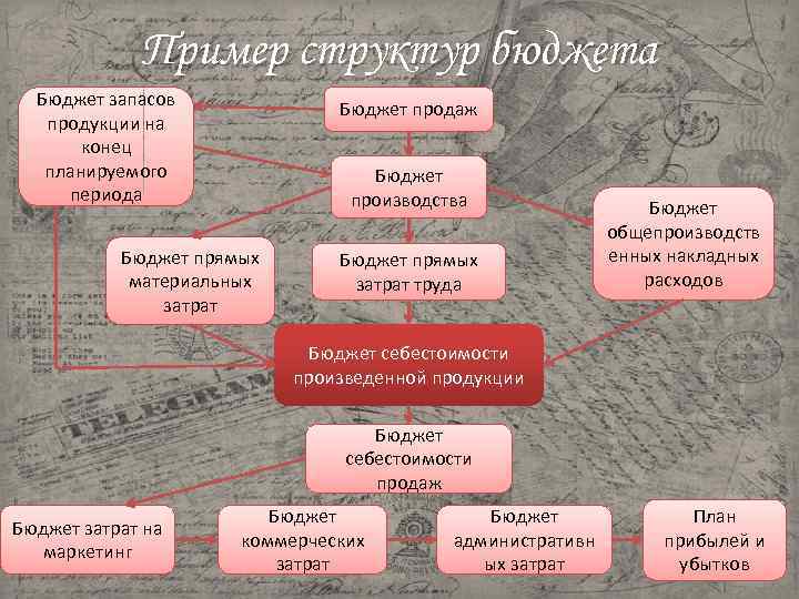 Пример структур бюджета Бюджет запасов продукции на конец планируемого периода Бюджет продаж Бюджет производства Бюджет прямых материальных затрат Бюджет прямых затрат труда Бюджет общепроизводств енных накладных расходов Бюджет себестоимости произведенной продукции Бюджет себестоимости продаж Бюджет затрат на маркетинг Бюджет коммерческих затрат Бюджет административн ых затрат План прибылей и убытков