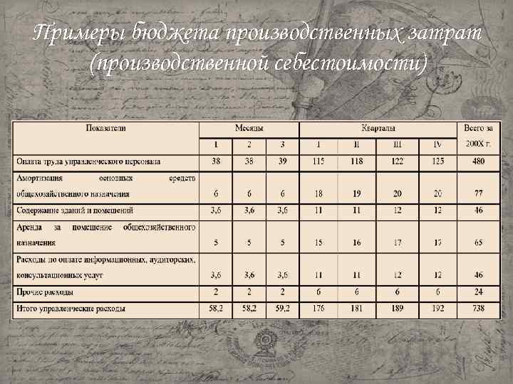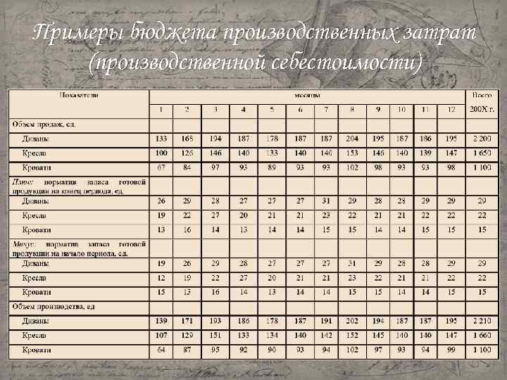 Примеры бюджета производственных затрат (производственной себестоимости)