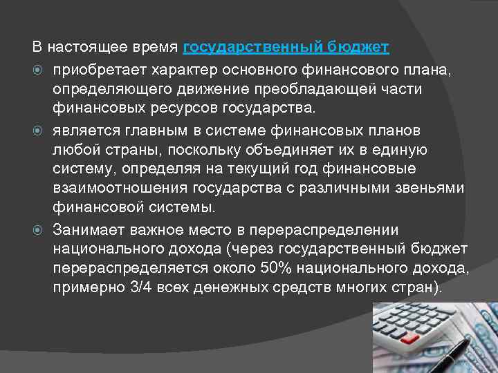 В настоящее время государственный бюджет приобретает характер основного финансового плана, определяющего движение преобладающей части финансовых ресурсов государства. является главным в системе финансовых планов любой страны, поскольку объединяет их в единую систему, определяя на текущий год финансовые взаимоотношения государства с различными звеньями финансовой системы. Занимает важное место в перераспределении национального дохода (через государственный бюджет перераспределяется около 50% национального дохода, примерно 3/4 всех денежных средств многих стран).