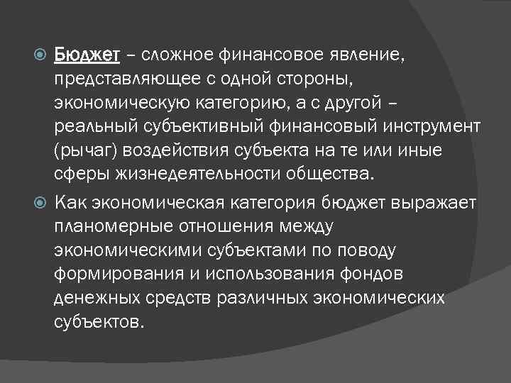 Бюджет – сложное финансовое явление, представляющее с одной стороны, экономическую категорию, а с другой – реальный субъективный финансовый инструмент (рычаг) воздействия субъекта на те или иные сферы жизнедеятельности общества. Как экономическая категория бюджет выражает планомерные отношения между экономическими субъектами по поводу формирования и использования фондов денежных средств различных экономических субъектов.