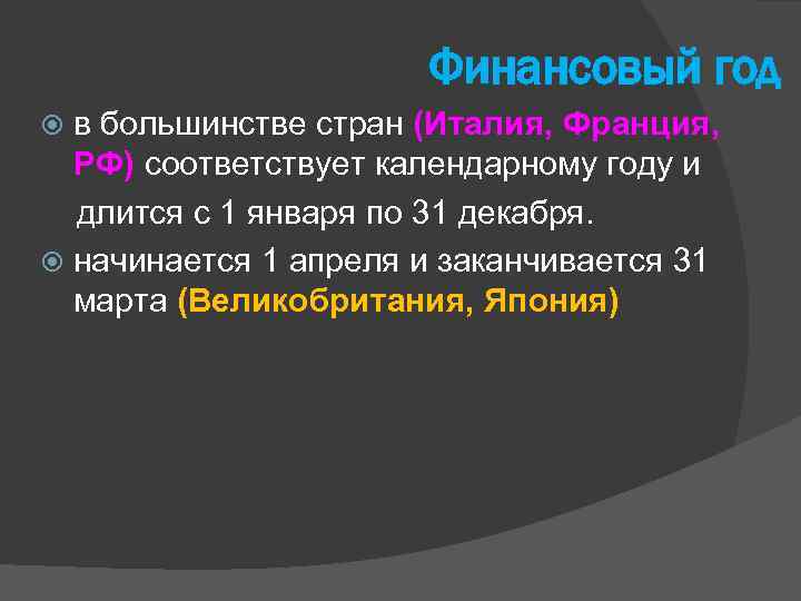 Финансовый год в большинстве стран (Италия, Франция, РФ) соответствует календарному году и длится с 1 января по 31 декабря. начинается 1 апреля и заканчивается 31 марта (Великобритания, Япония)