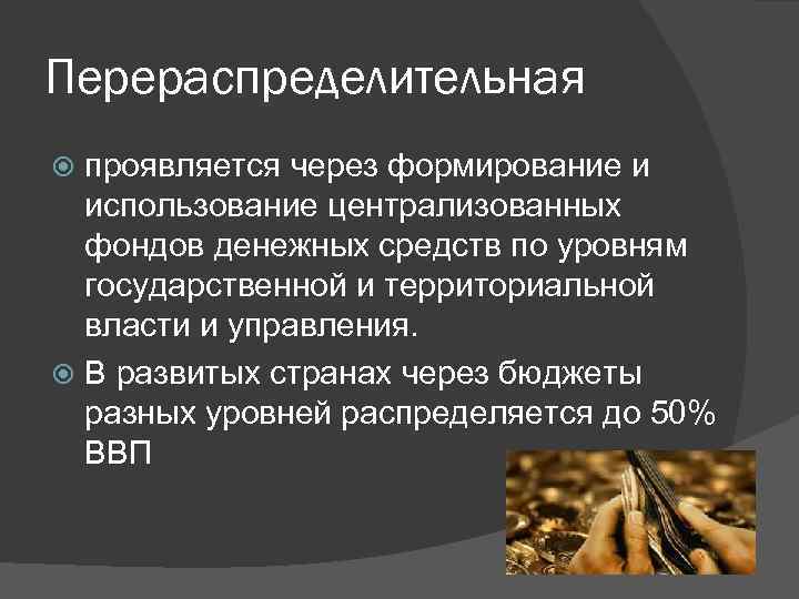Перераспределительная проявляется через формирование и использование централизованных фондов денежных средств по уровням государственной и территориальной власти и управления. В развитых странах через бюджеты разных уровней распределяется до 50% ВВП