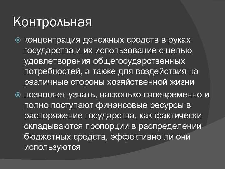 Контрольная концентрация денежных средств в руках государства и их использование с целью удовлетворения общегосударственных потребностей, а также для воздействия на различные стороны хозяйственной жизни позволяет узнать, насколько своевременно и полно поступают финансовые ресурсы в распоряжение государства, как фактически складываются пропорции в распределении бюджетных средств, эффективно ли они используются
