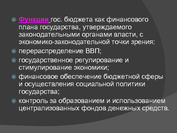 Функции гос. бюджета как финансового плана государства, утверждаемого законодательными органами власти, с экономико законодательной точки зрения: перераспределение ВВП; государственное регулирование и стимулирование экономики; финансовое обеспечение бюджетной сферы и осуществления социальной политики государства; контроль за образованием и использованием централизованных фондов денежных средств.
