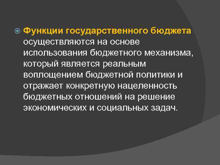 Функции государственного бюджета осуществляются на основе использования бюджетного механизма, который является реальным воплощением бюджетной политики и отражает конкретную нацеленность бюджетных отношений на решение экономических и социальных задач.