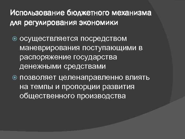 Использование бюджетного механизма для регулирования экономики осуществляется посредством маневрирования поступающими в распоряжение государства денежными средствами позволяет целенаправленно влиять на темпы и пропорции развития общественного производства