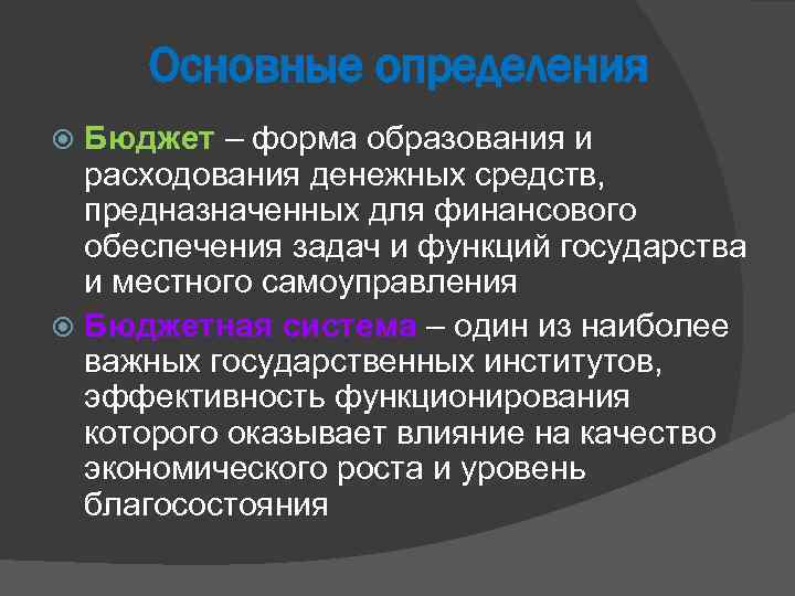 Основные определения Бюджет – форма образования и расходования денежных средств, предназначенных для финансового обеспечения задач и функций государства и местного самоуправления Бюджетная система – один из наиболее важных государственных институтов, эффективность функционирования которого оказывает влияние на качество экономического роста и уровень благосостояния