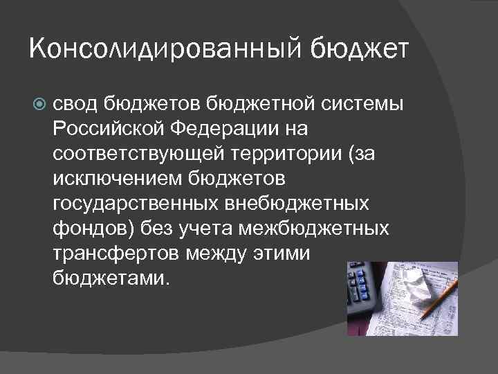 Консолидированный бюджет свод бюджетов бюджетной системы Российской Федерации на соответствующей территории (за исключением бюджетов государственных внебюджетных фондов) без учета межбюджетных трансфертов между этими бюджетами.