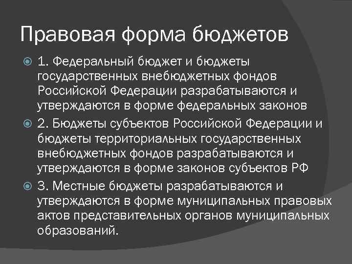 Правовая форма бюджетов 1. Федеральный бюджет и бюджеты государственных внебюджетных фондов Российской Федерации разрабатываются и утверждаются в форме федеральных законов 2. Бюджеты субъектов Российской Федерации и бюджеты территориальных государственных внебюджетных фондов разрабатываются и утверждаются в форме законов субъектов РФ 3. Местные бюджеты разрабатываются и утверждаются в форме муниципальных правовых актов представительных органов муниципальных образований.