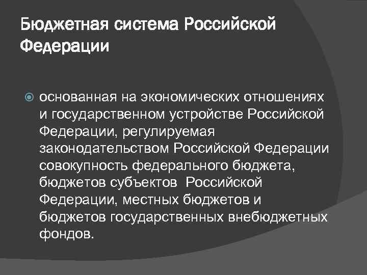 Бюджетная система Российской Федерации основанная на экономических отношениях и государственном устройстве Российской Федерации, регулируемая законодательством Российской Федерации совокупность федерального бюджета, бюджетов субъектов Российской Федерации, местных бюджетов и бюджетов государственных внебюджетных фондов.