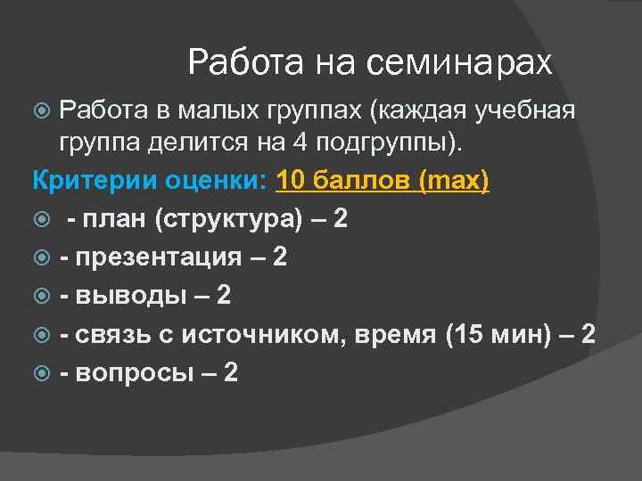 Работа на семинарах Работа в малых группах (каждая учебная группа делится на 4 подгруппы). Критерии оценки: 10 баллов (max) - план (структура) – 2 - презентация – 2 - выводы – 2 - связь с источником, время (15 мин) – 2 - вопросы – 2