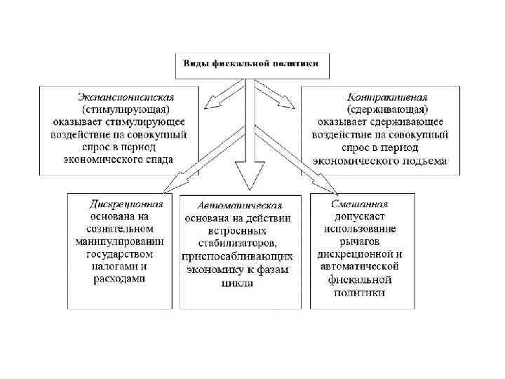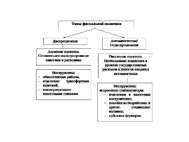 Виды БНП • Краткосрочная и долгосрочная политика. Краткосрочная БНП - используется в условиях отсутствия полной занятости с целью снижения безработицы и роста занятости. Она сопровождается сокращением рецессивного разрыва. Долгосрочная БНП - используется в условиях полной занятости с целью ограничения роста цен, который характерен для экономики при полной занятости. Она сопровождается уменьшением инфляционного разрыва. • Стимулирующая и сдерживающая политика. Стимулирующая ( фискальная экспансия) связана с увеличением государственных расходов и снижением налогов. Сдерживающая ( фискальная рестрикция) связана с увеличением налогов и снижением государственных расходов. • Дискреционная и недискреционная политика.