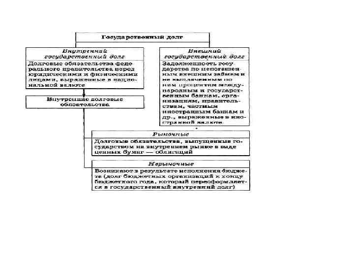 Государственный долг – накопленный дефицит бюджета за вычетом бюджетного излишка. Нормальная ситуация - 10% ВВП Внутренний долг: заемщик – правительство кредиторы- экономические структуры (организации и население страны, резиденты) Внутренние займы представлены в виде государственных ценных бумаг Внутренний долг сопровождается: -перераспределением доходов -эффектом вытеснения инвестиций внутри страны (часть доходов в государственные ценные бумаги) -снижением денежной массы и кредиторских ресурсов в экономике. -рост долга в будущем сопровождается увеличением налогов