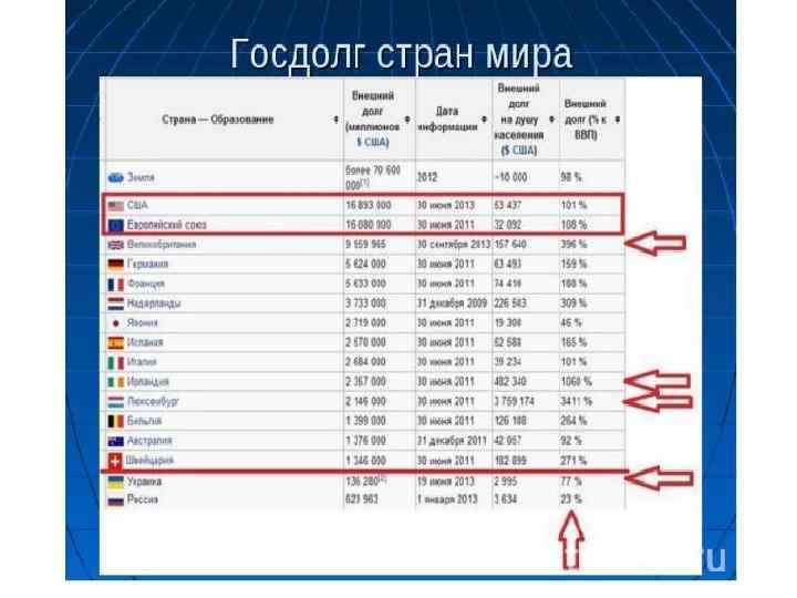 Внешний долг: заемщик – правительство данной страны кредиторы – иностранные государства и организации (банки, финансовые компании, фонды), население других стран (не резиденты), которые приобретают ценные бумаги данного государства. Внешний долг отражает экономические и политические факторы. Интересы кредиторов: - влияние на структурные изменения в экономике данной страны - создание условий для вывоза капитала ведущих стран мира - усиление экономической зависимости от ведущих стран мира - военно-политические интересы - территориальные интересы