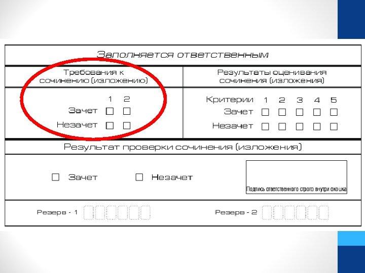 • Члены комиссии ставят «Z» на полях бланков записи, оставшихся незаполненными (в том числе и на его оборотной стороне). • В бланках регистрации члены комиссии заполняют поле «Количество бланков записи» . В указанное поле вписывается количество бланков записи (минимум « 2» ), включая дополнительные бланки записи (в случае если такие выдавались по запросу участника). • Члены комиссии заполняют отчетные формы, а также форму ИС 05 «Ведомость проведения» . В свою очередь, участник проверяет данные, внесенные в ведомость, подтверждая их личной подписью. • В случае если участник по состоянию здоровья или другим объективным причинам не может завершить написание сочинения, он может покинуть место проведения сочинения. Члены комиссии составляют «Акт о досрочном завершении» (форма ИС-08), вносят соответствующую отметку в форму ИС-05 «Ведомость» . В бланке регистрации в поле «Резерв-1» необходимо внести отметку «ИС-08» .