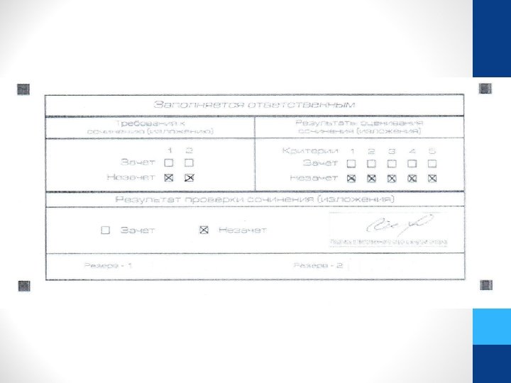 • Эксперты комиссии ОО перед осуществлением проверки по 5 критериям оценивания проверяют соблюдение 2 -х требований: «Объем сочинения (изложения)» и «Самостоятельность написания итогового сочинения (изложения)» . • Каждое сочинение (изложение) участников итогового сочинения (изложения) проверяется одним экспертом один раз. • Результаты проверки по критериям оценивания ( «зачет» / «незачет» ) вносятся в копию бланка регистрации (в случае несоблюдения участником хотя бы одного из установленных требований в копии бланка регистрации необходимо заполнить соответствующее поле «незачет» и внести оценку «незачет» по всей работе в целом). • Копии бланков участников эксперты комиссии передают руководителю ОО. • Ответственное лицо, уполномоченное руководителем ОО, переносит результаты проверки по критериям оценивания ( «зачет» / «незачет» ) из копий бланков регистрации в оригиналы бланков регистрации.
