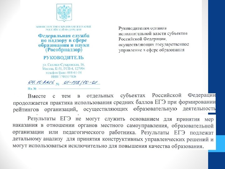 Изменения Порядка проведения ГИА-11 (аналогично - ГИА-9) • Межрегиональная апелляция (перекрестная апелляция); • Требования к подготовке кадров (ОИВ должны определить Порядок отбора специалистов, привлекаемых к ГИА); • Руководители образовательных организаций и органов местного самоуправления, осуществляющих управление в сфере образования обязаны: üосуществлять контроль за участием своих работников в проведении ГИА; üпод роспись информировать указанных работников о сроках, местах, порядке проведения ГИА… Ответственность директоров ОО за работу организаторов ППЭ
