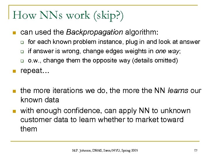 How NNs work (skip? ) n hope: plug in customer out comes whether we should market toward him n How does it get the right answer? n n Initially, all weights are random! But: we assume we have data for lots of people which we know to be either interested in our products or not (let’s say) q n we have data for both kinds So: when we plug in one of these customers, we know what the right answer is supposed to be M. P. Johnson, DBMS, Stern/NYU, Spring 2005 16