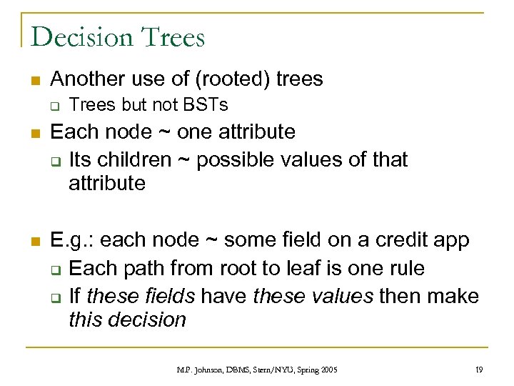 Decision Trees n Another use of (rooted) trees q Trees but not BSTs n Each node ~ one attribute q Its children ~ possible values of that attribute n E. g. : each node ~ some field on a credit app q Each path from root to leaf is one rule q If these fields have these values then make this decision M. P. Johnson, DBMS, Stern/NYU, Spring 2005 19