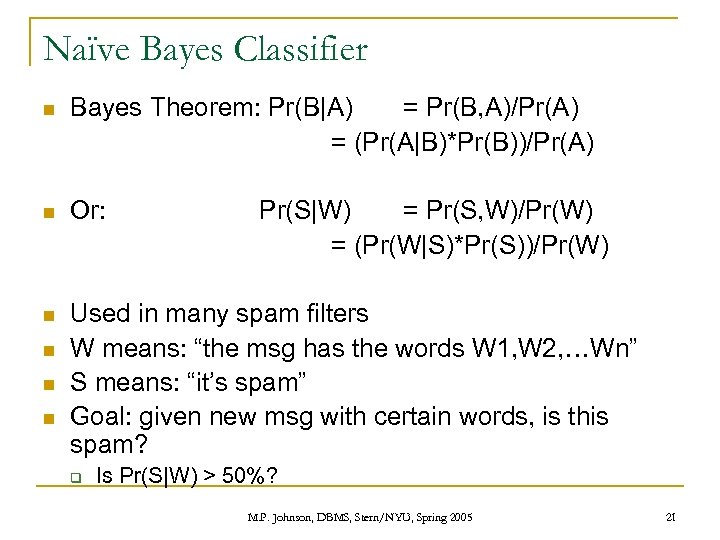 Naïve Bayes Classifier n Bayes Theorem: Pr(B|A) = Pr(B, A)/Pr(A) = (Pr(A|B)*Pr(B))/Pr(A) n Or: n Used in many spam filters W means: “the msg has the words W 1, W 2, …Wn” S means: “it’s spam” Goal: given new msg with certain words, is this spam? n n n q Pr(S|W) = Pr(S, W)/Pr(W) = (Pr(W|S)*Pr(S))/Pr(W) Is Pr(S|W) > 50%? M. P. Johnson, DBMS, Stern/NYU, Spring 2005 21