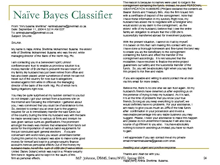 Naïve Bayes Classifier From: "mrs bulama shettima" <aminabulama@pnetmail. co. za Date: September 11, 2004 4: 32: 14 AM EDT To: aminabulama@pnetmail. co. za Subject: SALAM. My name is Hajia Amina Shettima Mohammed Bulama the eldest wife of Shettima Mohammed Bulama who was the est. while managing director of the Bank of the North Nig, Plc. I am contacting you in a benevolent spirit; utmost confidence and trust to enable us provide a solution to a money transfer of $12 M that is presentlt the last resort of my family. My husband has just been retired from office and has also been placed under survelience of which he can not travel out of the country for now due to allegations levelled against him while in office as the Managing director of the bank of the north Nig. Plc of which he is facing litigations right now. You may be quite surprised at my sudden contact to you but do not despair, I got your contact from a business site on the internet and following the information I gathered about you, I was convinced that you could be of assistance to me. So, decided to contact you at once due to the urgency required for us to immediately transfer the said funds out of the country. During the time my husband was with the bank he made several loans to various oil firms and inreturn he was given various sums as gratifications. The prominent amongst the deals was monies that emanated from funds set aside for the importation of various ballot equipmemts for the just concluded april general elections . If you are conversant with world news, you would understand better. During this period my husband was able to make some good money for himself and kept in a private security finance accounts here as persopnal effects. Out of the money my husband made, he left the sum of US$12 M (Twelve Mllion United States Dollars) which was kept in a Private security firm here in Nigeria and he kept it in the vaults of this firm as personal effects. M. P. Johnson, The reason is because no names were used to lodge in the consignment containing the funds. Instead, he used PERSONAL IDENTIFICATION NUMBERS (PIN)and declared the contents as Bearer Bonds and Treasury Bills. Also the firm issued him with a certificate of deposit of the consignment. Note that I have these information in my custody. Right now, my husband has asked me to negotiate with a foreigner who would assist us lay claim to the consignment, as the eldest wife of my husband, I believe that I owe the entire family an obligation to ensure that the US$12 M is successfully transferred abroad for investment purposes. With the present situation, I cannot do it all by myself. It is based on this that I am making this contact with you. I have done a thorough homework and fine-tuned the best way to create you as the beneficiary to the consignment containing the funds and effect the transfer of the consignment accordingly. It is rest assured that the modalities I have resolved to finalize the entire project guarantees our safety and the successful transfer of the funds. So, you will be absolutely right when you say that this project is risk free and viable. If you are capable and willing to assist, contact me at once via this email for more details. Believe me, there is no one else we can trust again. All my husband's friends have deserted us after exploiting us on the pretence of trying to help my husband. As it is said, it is at the time of problems that you know your true friends. So long as you keep everything to yourself, we would definitely have no problems. For your assistance, I am ready to give you as much as 25% of the total funds after confirmation in your possession and invest a reasonable percentage into any viable business you may suggest. Please, I need your assistance to make this happen and please do not undermine it because it will also be a source of up liftment to you also. You have absolutely nothing to loose in assisting us instead, you have so much to gain. I will appreciate if you can contact me at my private email: mrsaminabulama@gawab. com once. Awaiting your urgent and positive response. Thanks and Allah be with you. DBMS, Stern/NYU, Spring 2005 Hajia (Mrs) Amina Shettima Bulama. 24