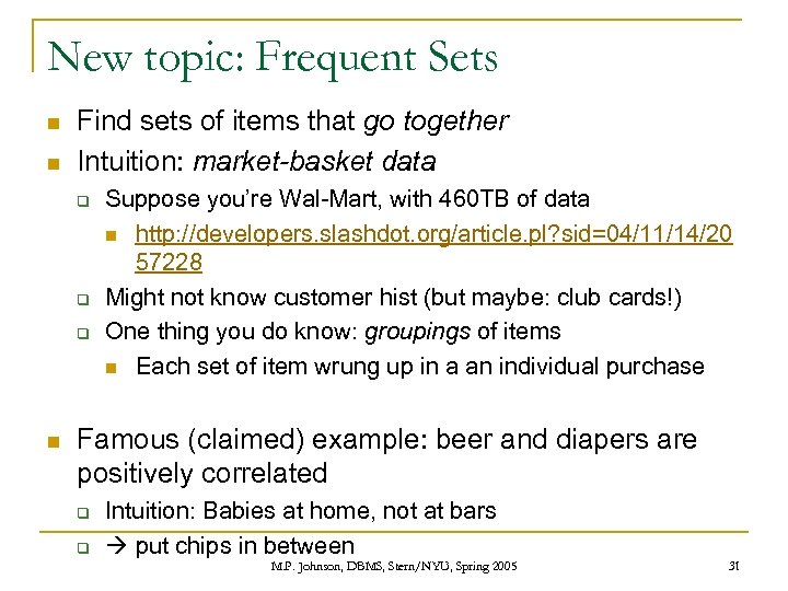 New topic: Frequent Sets n n Find sets of items that go together Intuition: market-basket data q q q n Suppose you’re Wal-Mart, with 460 TB of data n http: //developers. slashdot. org/article. pl? sid=04/11/14/20 57228 Might not know customer hist (but maybe: club cards!) One thing you do know: groupings of items n Each set of item wrung up in a an individual purchase Famous (claimed) example: beer and diapers are positively correlated q q Intuition: Babies at home, not at bars put chips in between M. P. Johnson, DBMS, Stern/NYU, Spring 2005 31