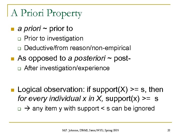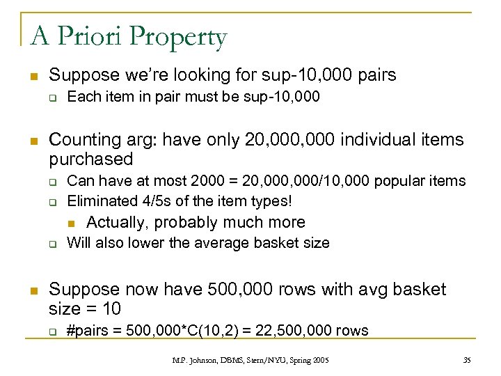 A Priori Property n a priori ~ prior to q q n As opposed to a posteriori ~ postq n Prior to investigation Deductive/from reason/non-empirical After investigation/experience Logical observation: if support(X) >= s, then for every individual x in X, support(x) >= s q any item y with support < s can be ignored M. P. Johnson, DBMS, Stern/NYU, Spring 2005 33